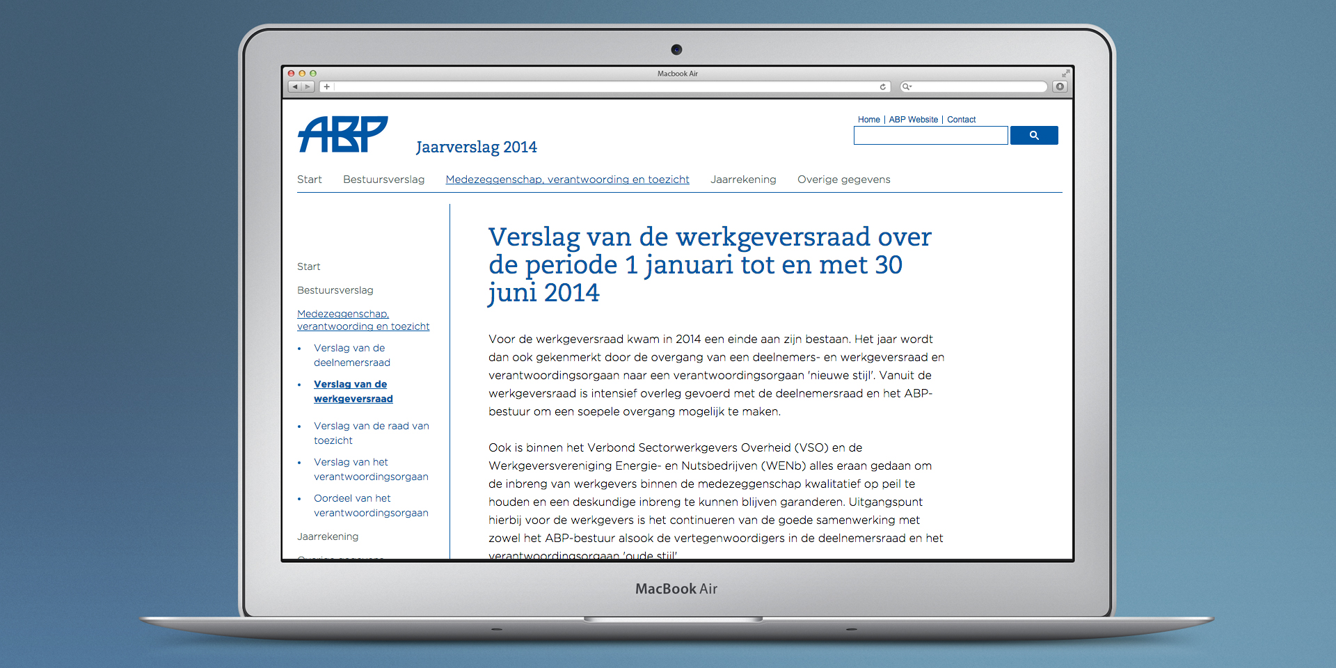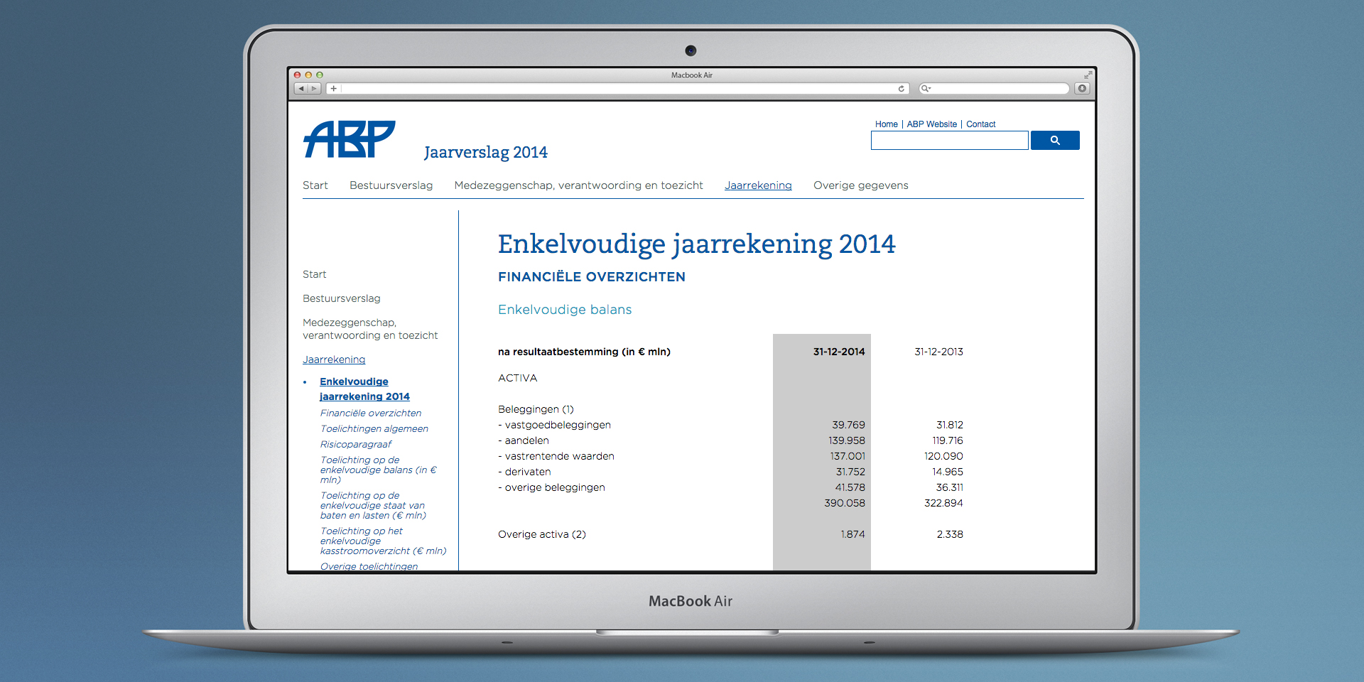 Pensioenfonds ABP is het bedrijfstakpensioenfonds voor de overheid en het onderwijs. ABP staat voor Algemeen Burgerlijk Pensioenfonds, het ABP is het grootste pensioenfonds van Nederland, alle ambtenaren - ook de gepensioneerden - zijn erbij aangesloten. Mattmo ceëerde hun online jaarverslag. Bekijk de website.